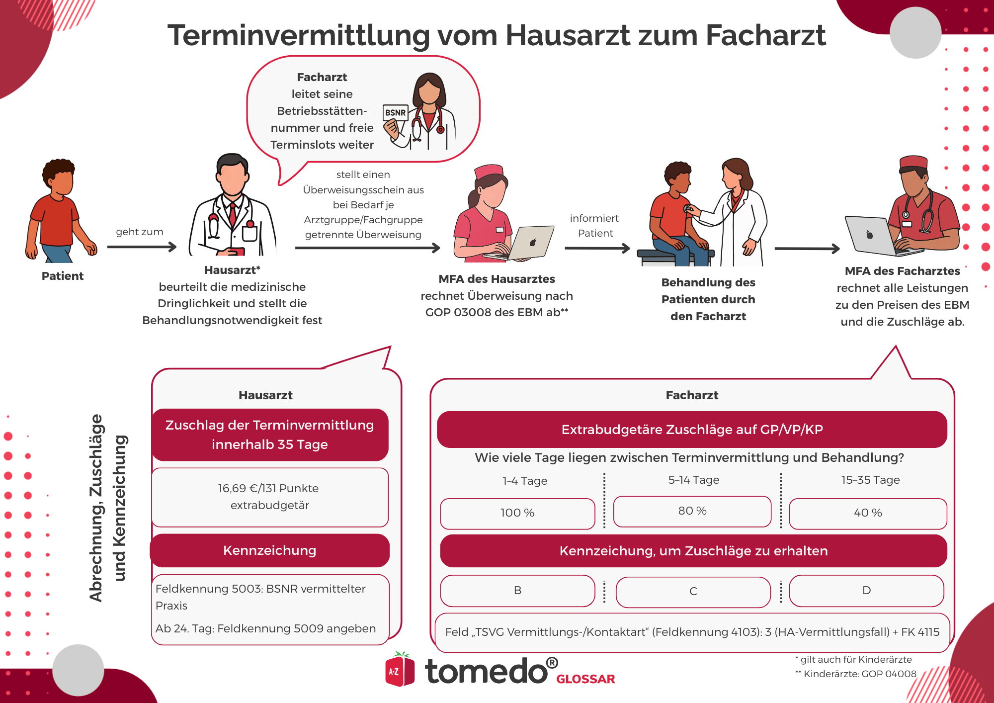 Seit dem 1. Januar 2023 wird die Vermittlung eines dringend erforderlichen Facharzt- oder Psychotherapeutentermins durch Haus- bzw. Kinderärzte mit einem erhöhten Zuschlag nach GOP 03008/04008 EBM (16,69 € / 131 Punkte) vergütet. Die Abrechnung erfolgt unter Angabe der BSNR der vermittelten Facharztpraxis (Feldkennung 5003).